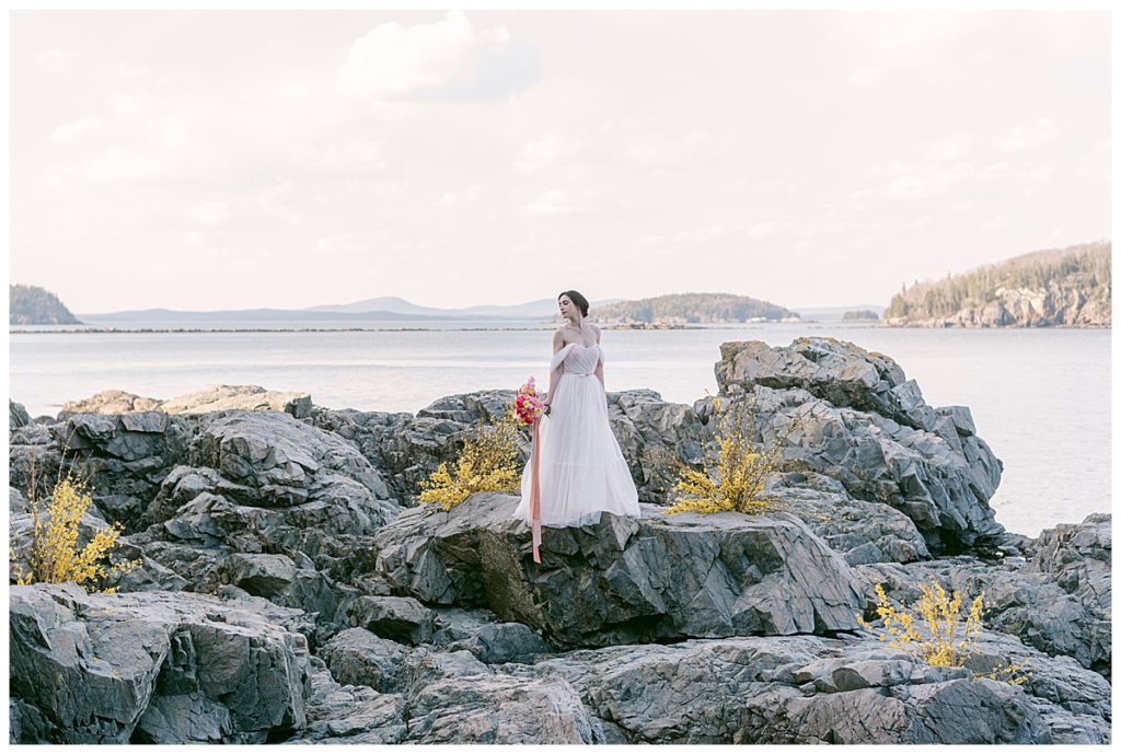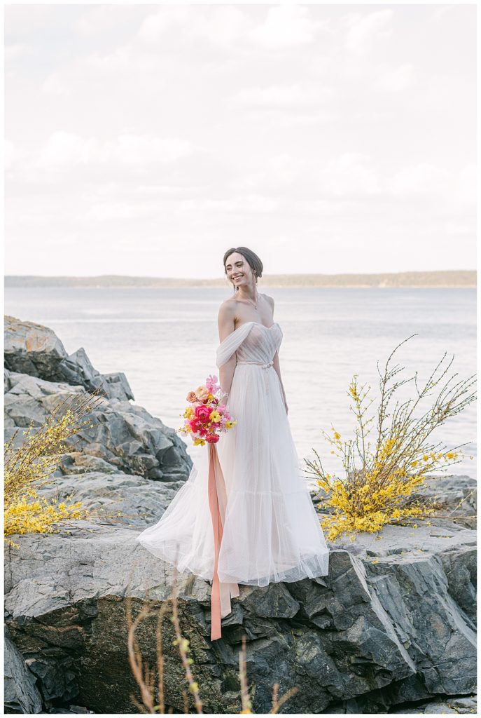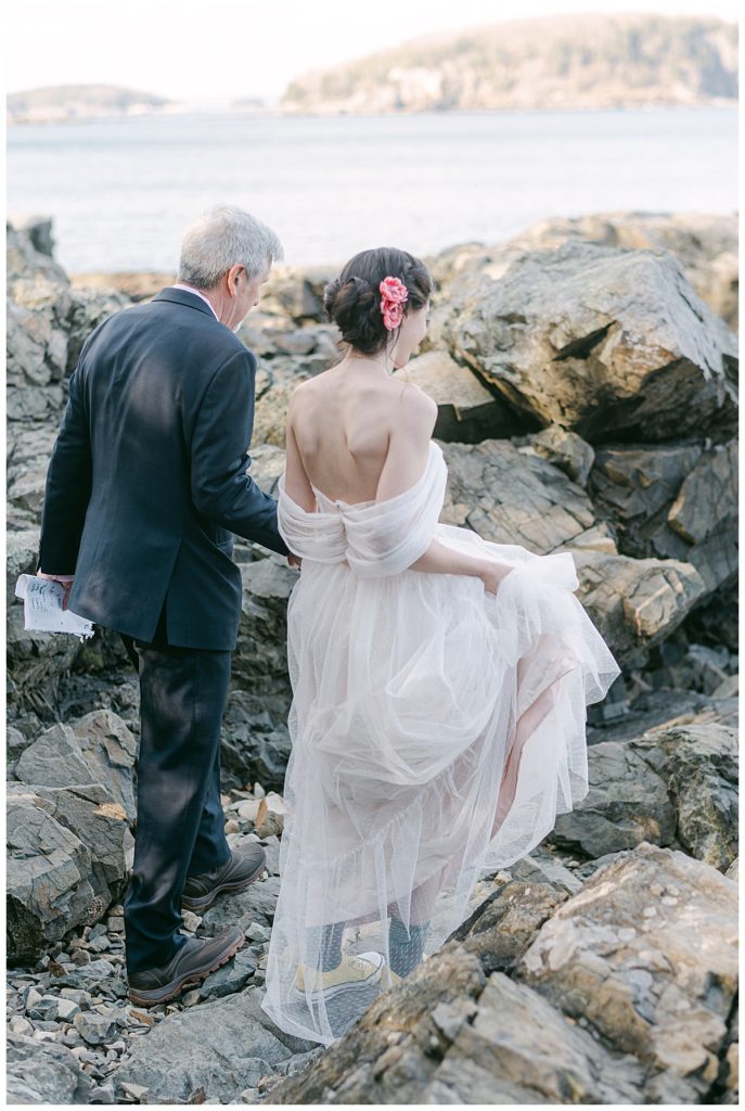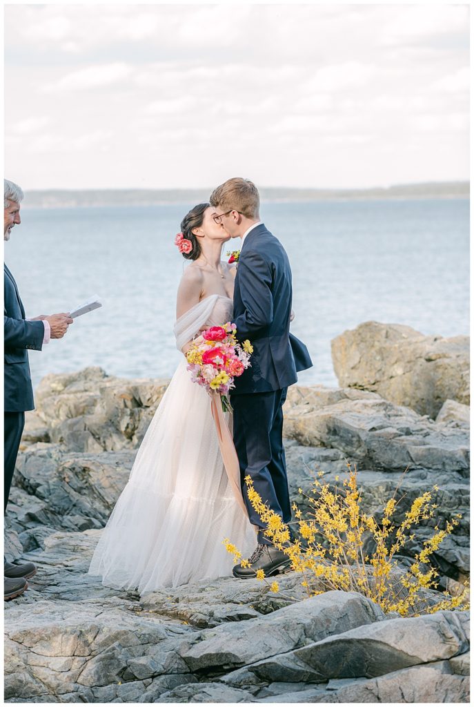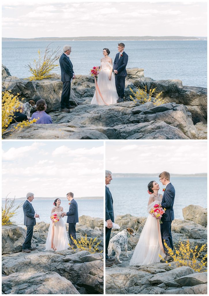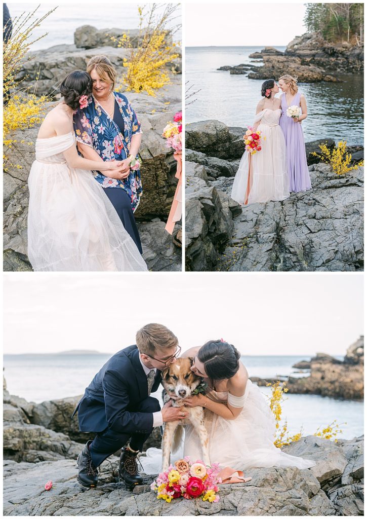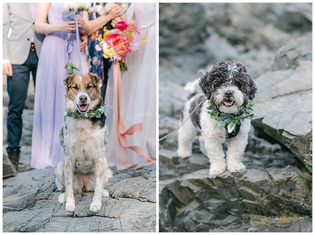 I joined a talented team of creatives to capture this gorgeous real elopement in Bar Harbor, Maine. Meet Kristen and Daniel! They traveled from Massachusetts with their immediate family and it was such a perfect day for them to say I DO! The florals were stunning and I could not get enough of all the fun details that went along it! Her father walked her down the rocks and also performed the services and it was so special with some laughs and tears. They also brought along their adorable pups, Zooey and Charlie who wore beautiful floral collars for their mom and dad! Kristen wore the cutest converse sneakers so she could easily navigate on the cliffs and rocks. It definitely made for some fun dancing photos! We were blessed with some of most gorgeous vies and scenery Maine has to offer.