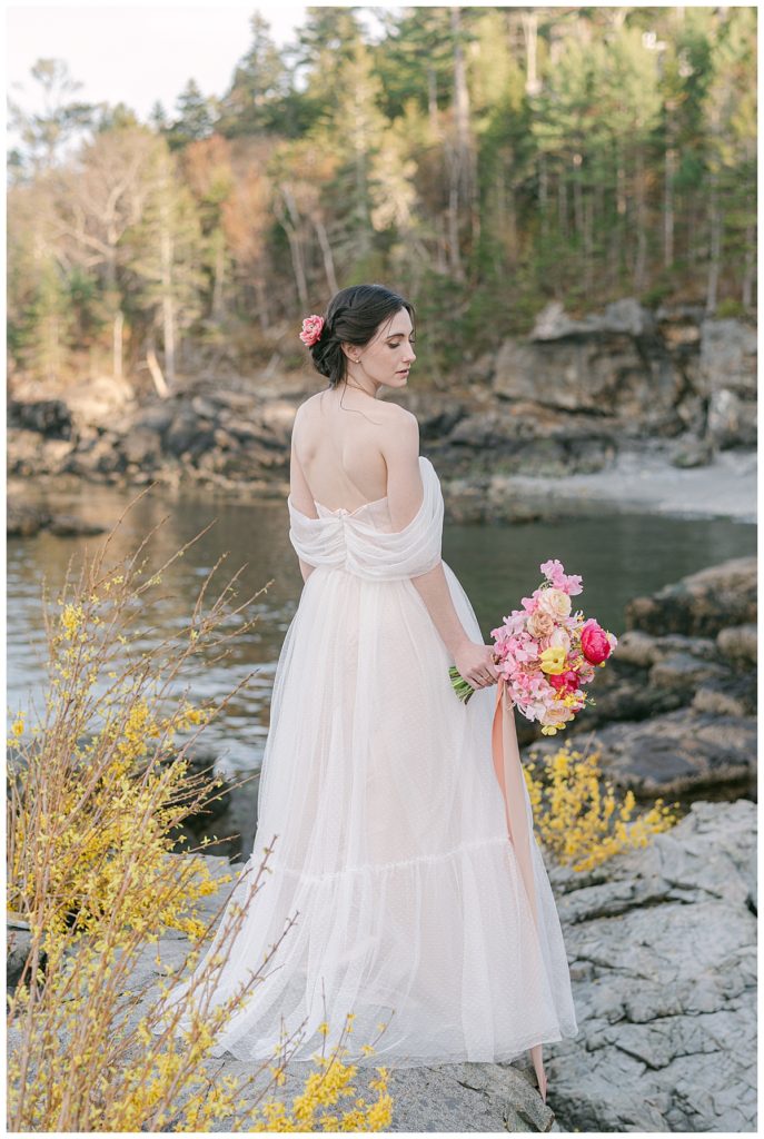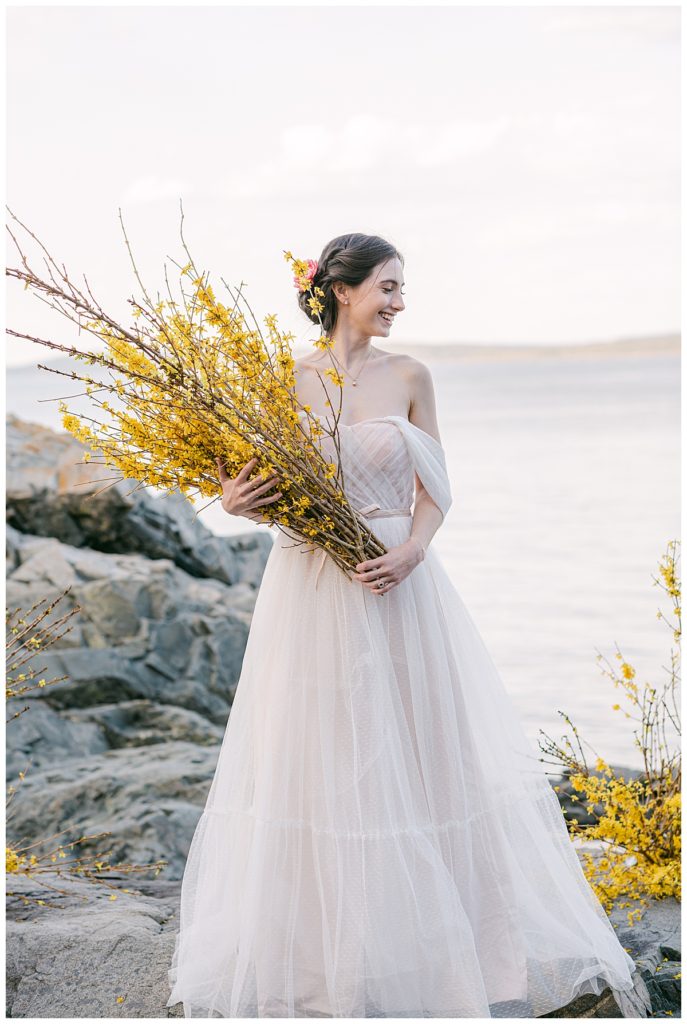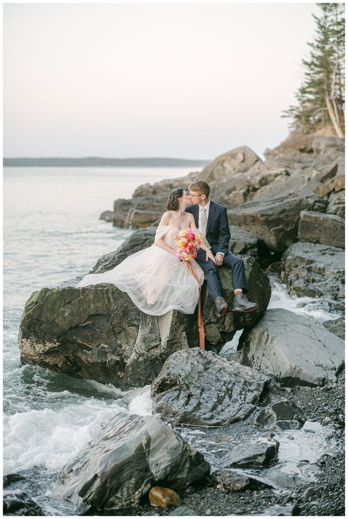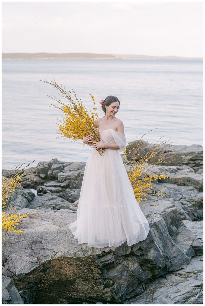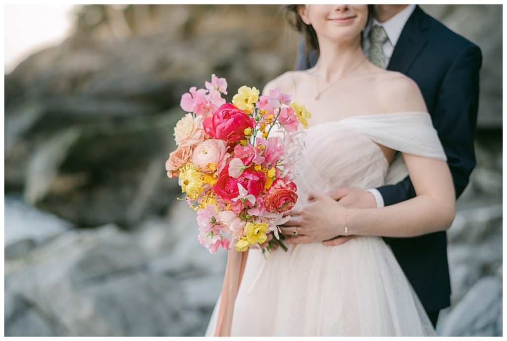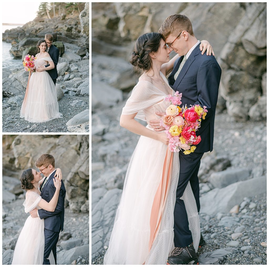 I joined a talented team of creatives to capture this gorgeous real elopement in Bar Harbor, Maine. Meet Kristen and Daniel! They traveled from Massachusetts with their immediate family and it was such a perfect day for them to say I DO! The florals were stunning and I could not get enough of all the fun details that went along it! Her father walked her down the rocks and also performed the services and it was so special with some laughs and tears. They also brought along their adorable pups, Zooey and Charlie who wore beautiful floral collars for their mom and dad! Kristen wore the cutest converse sneakers so she could easily navigate on the cliffs and rocks. It definitely made for some fun dancing photos! We were blessed with some of most gorgeous vies and scenery Maine has to offer.