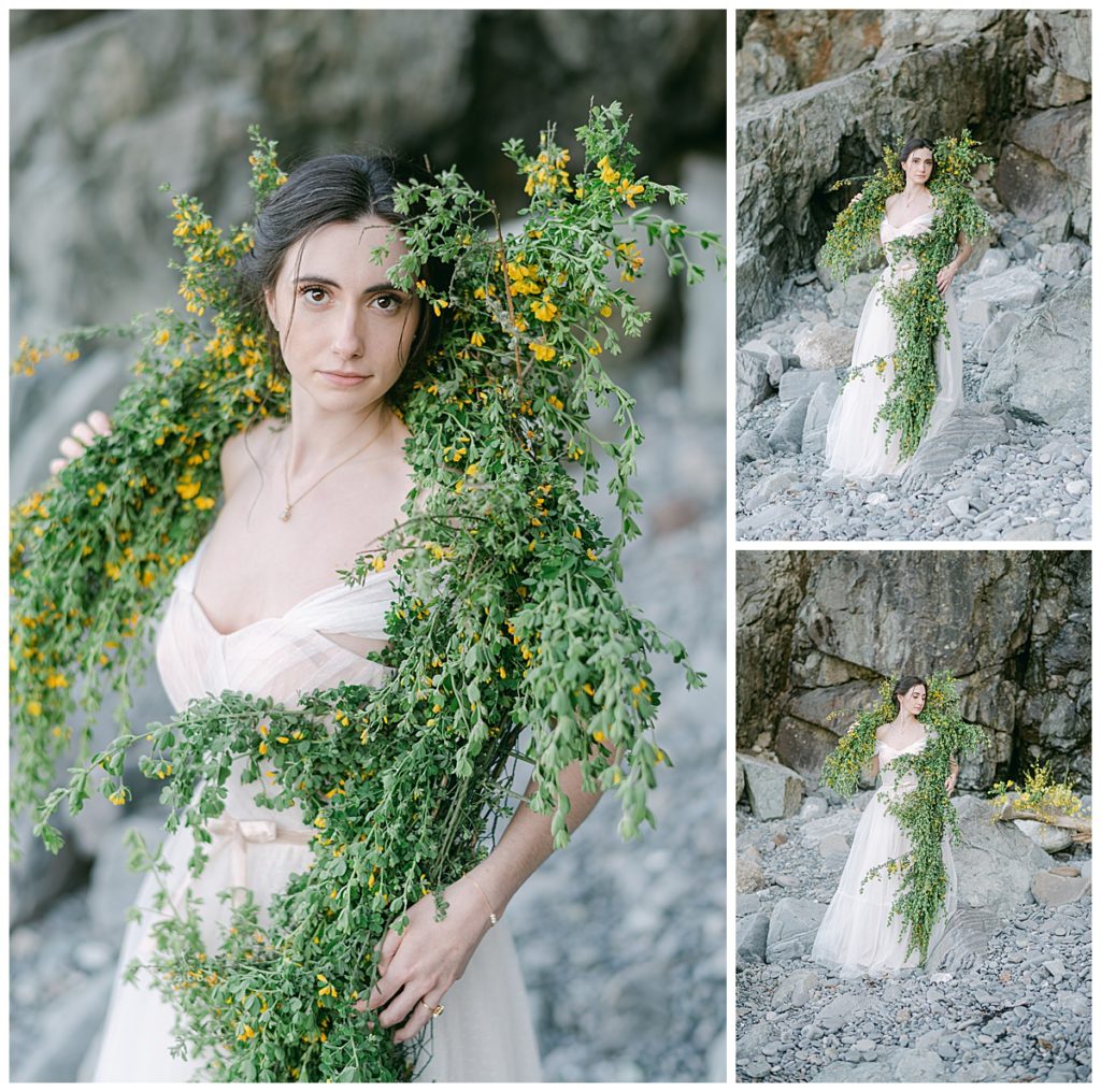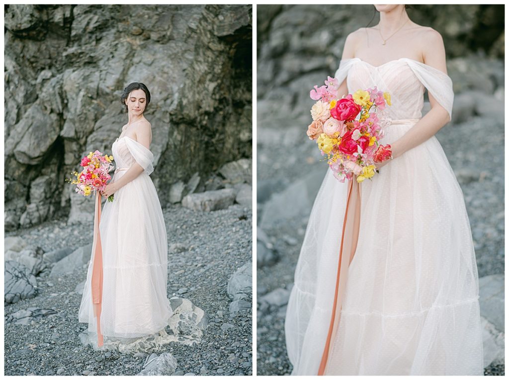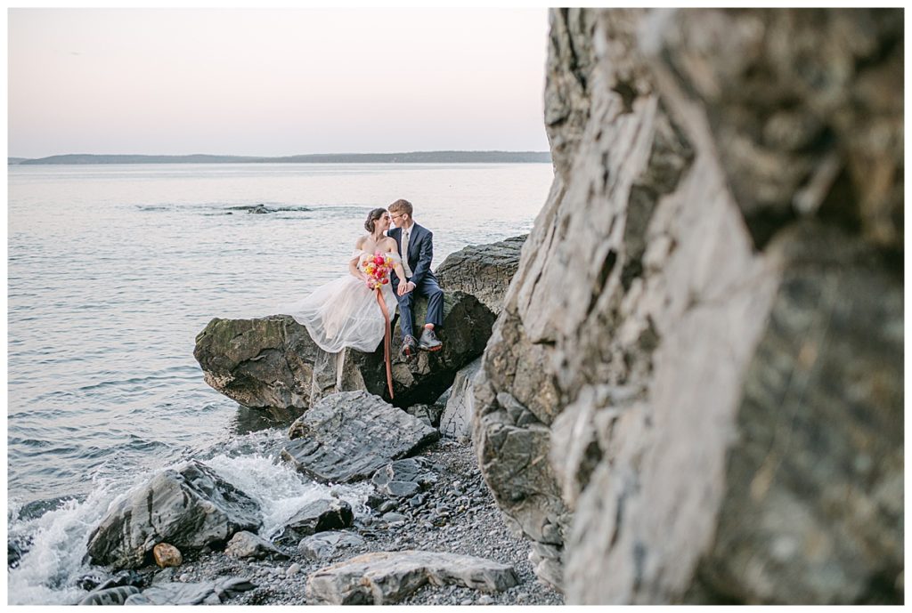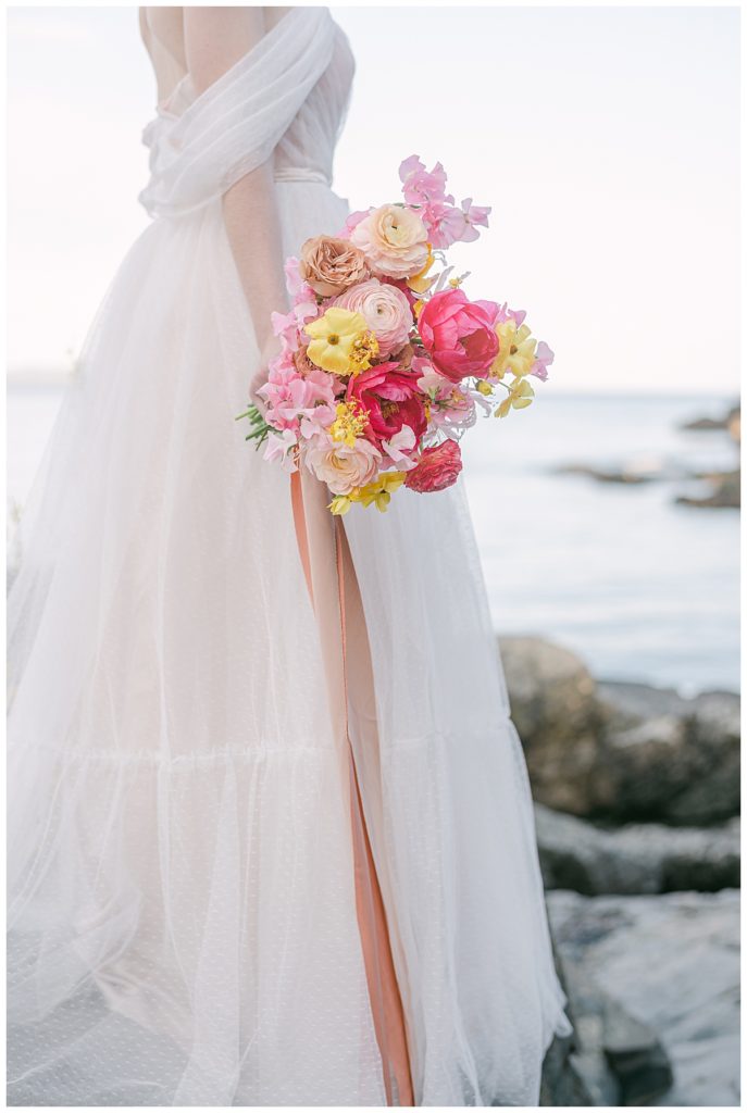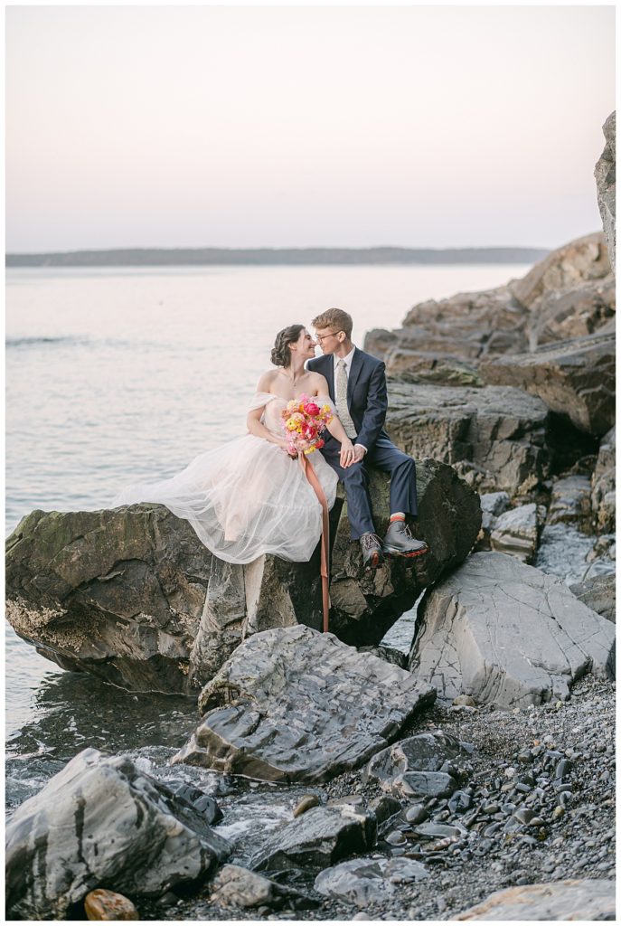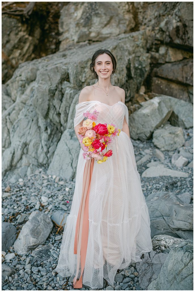 I joined a talented team of creatives to capture this gorgeous real elopement in Bar Harbor, Maine. Meet Kristen and Daniel! They traveled from Massachusetts with their immediate family and it was such a perfect day for them to say I DO! The florals were stunning and I could not get enough of all the fun details that went along it! Her father walked her down the rocks and also performed the services and it was so special with some laughs and tears. They also brought along their adorable pups, Zooey and Charlie who wore beautiful floral collars for their mom and dad! Kristen wore the cutest converse sneakers so she could easily navigate on the cliffs and rocks. It definitely made for some fun dancing photos! We were blessed with some of most gorgeous vies and scenery Maine has to offer.